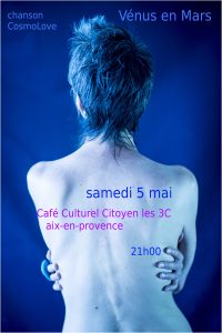 Marilyne Maillot auteure – chanteuse et créatrice de Vénus en Mars rencontre Shann Liegl guitariste et Arnaud Victorin bassiste en 2016 à l’IMFP de Salon de Provence – C’est la fusion de la chanson, du jazz et de l’électro. Un univers poétique , une présence et une voix incarnées par Vénus, des ondes planantes et du groove romantique incarnés par la musique des martiens – Ce trio vous invite pour un voyage au frontière de l’intime.